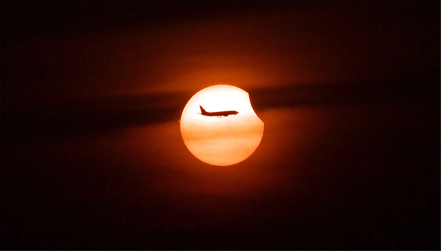 ????8月11日18時40分許,日偏食導致西落的太陽缺了一小口,武漢上空一架民航客機恰巧從太陽前方飛過。