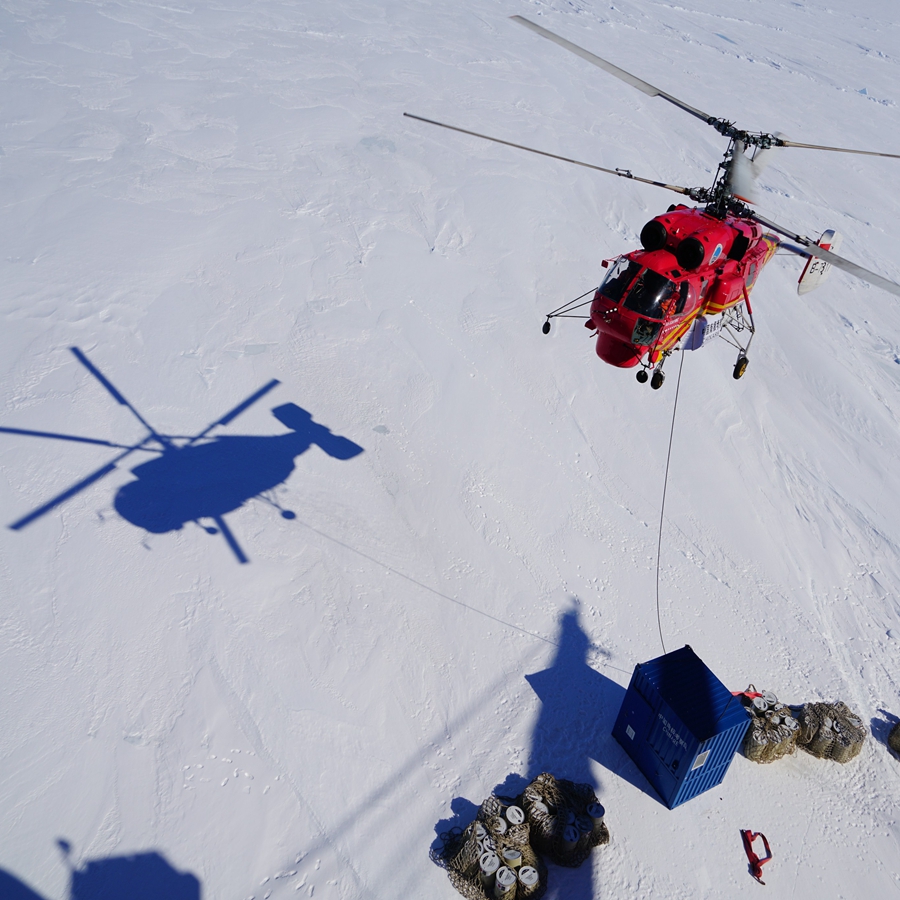 ????“雪龍”號停止破冰后,直升機往中山站運送物資。
