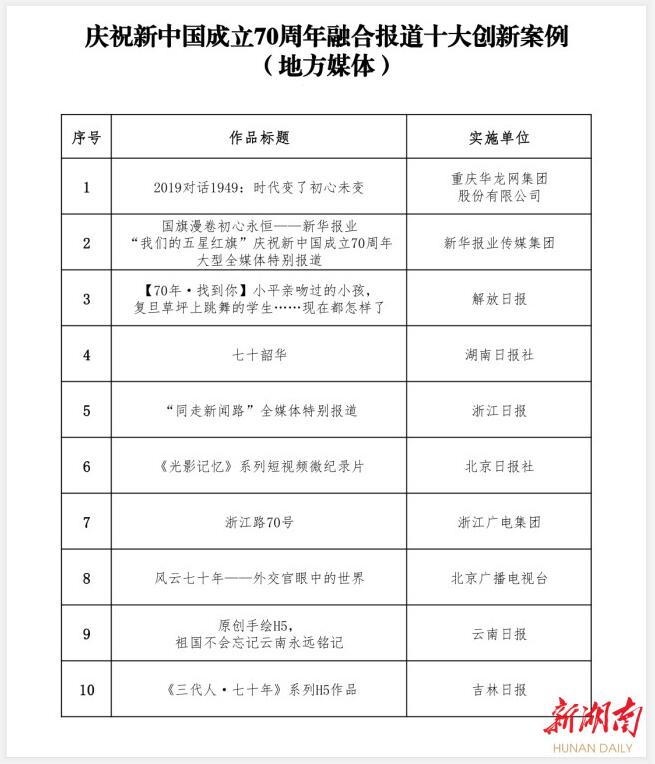 重慶華龍網集團股份有限公司、新華報業傳媒集團、解放日報、湖南日報社、浙江日報、北京日報社、浙江廣電集團、北京廣播電視臺、云南日報、吉林日報獲慶祝新中國成立 70 周年融合報道十大創新案例(地方媒體)。