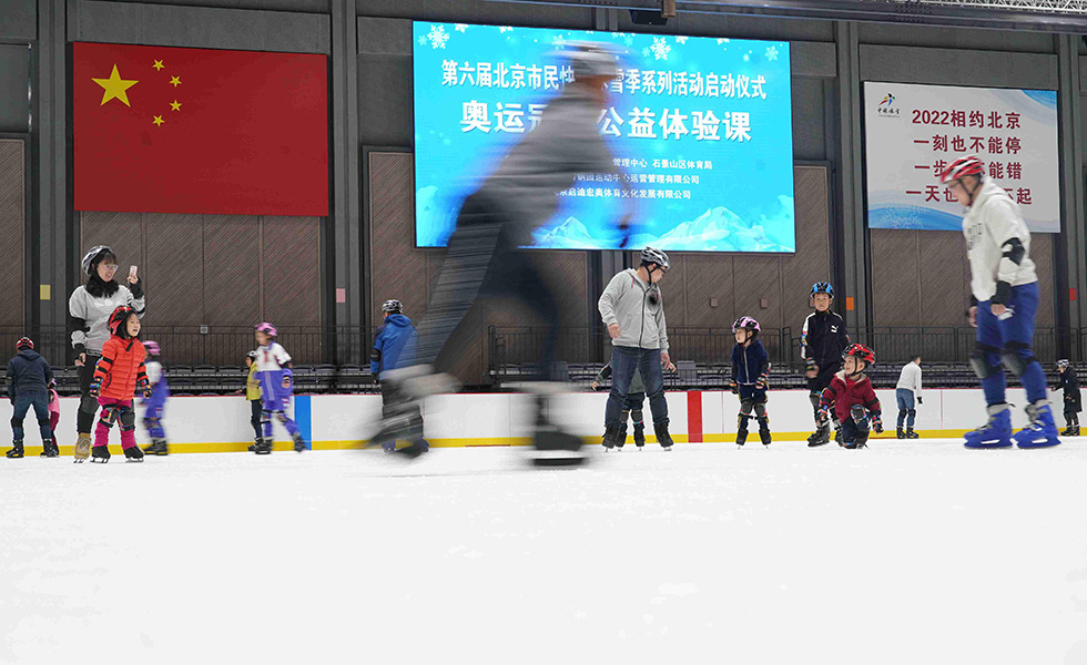 圖一:11月24日,北京首鋼冬訓中心花滑館,市民參加冰上體驗活動。這里原為首鋼老廠區精煤車間,改造后成為冬季運動訓練場館。