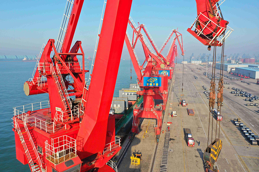 圖二:12月4日,首鋼京唐公司成品碼頭繁忙的作業現場。該碼頭已成為北方地區最大的精品鋼材專業化碼頭,公司生產的產品通過這里發往全國各地,被譽為"海上鋼鐵夢工廠"。