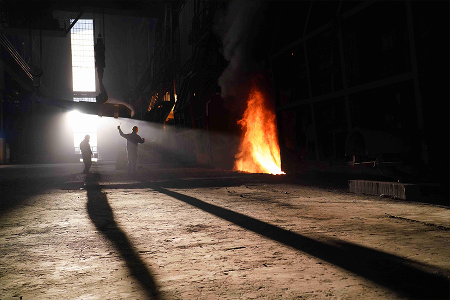 圖三:12月3日,首鋼京唐公司煉鋼作業部煉鋼作業區員工在煉鋼。近幾年來,該公司自主創新"全三脫"煉鋼工藝,打造出國內第一個高效率低成本的潔凈鋼生產平臺。自投產以來,首鋼京唐公司獲得科學技術獎項104項。
