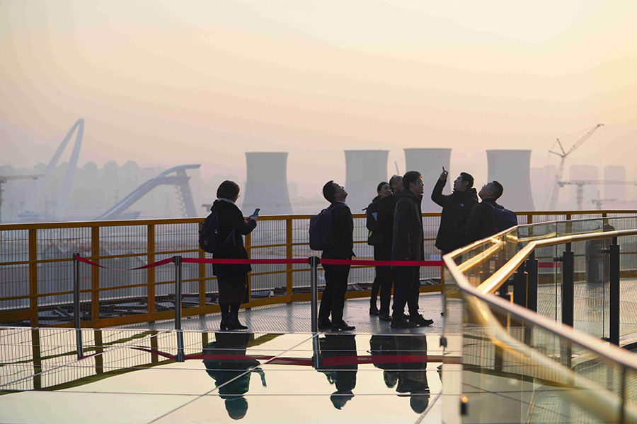 圖五:12月6日,參觀者在北京首鋼園區三高爐觀景臺眺望園區。遠處4座體型巨大的冷卻塔旁,滑雪大跳臺初露芳容,這是北京冬奧會北京賽區首個完工的新建場館,屆時將在此舉辦跳臺滑雪比賽項目。