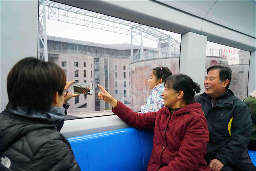 圖六: 11月15日,首鋼退休職工張建國(右一)一家三代乘坐北京首條磁懸浮列車S1線,觀看首鋼新園區景色。張建國的父親、哥哥和妹妹都是首鋼老職工,對首鋼情有獨鐘。