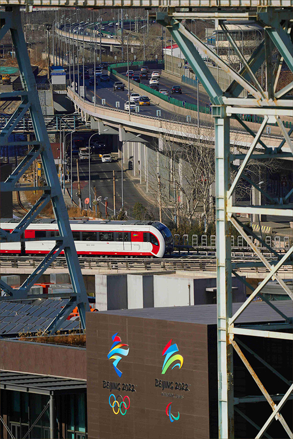 圖七:12月19日,北京首條磁懸浮地鐵列車穿過冬奧組委所在地的首鋼園區。經過多年發展,這里已經從傳統老工業園區轉型升級為高端產業綜合服務區,這片工業遺存重煥青春。