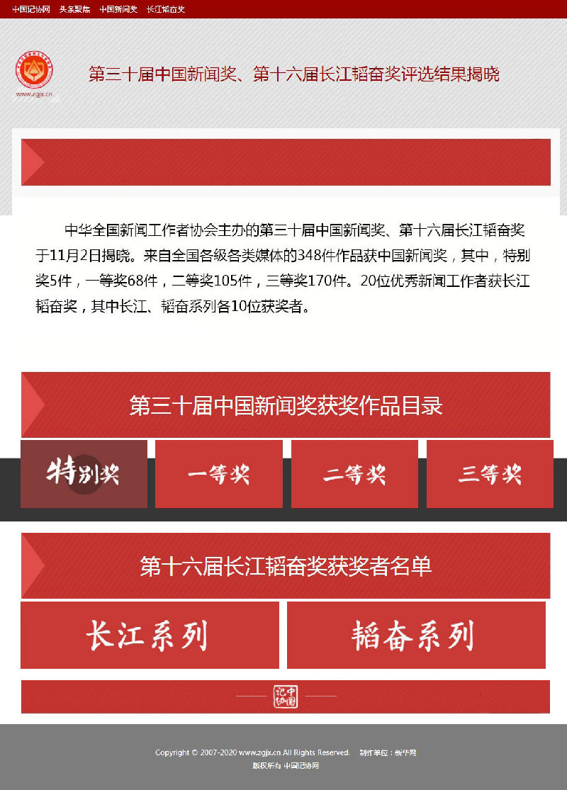新華社北京11月2日電 中華全國新聞工作者協會主辦的第三十屆中國新聞獎、第十六屆長江韜奮獎評選結果11月2日揭曉。來自全國各級各類媒體的348件作品獲中國新聞獎,其中,特別獎5件,一等獎68件,二等獎105件,三等獎170件。同時評出的還有長江韜奮獎,長江、韜奮系列各10位獲獎者。
