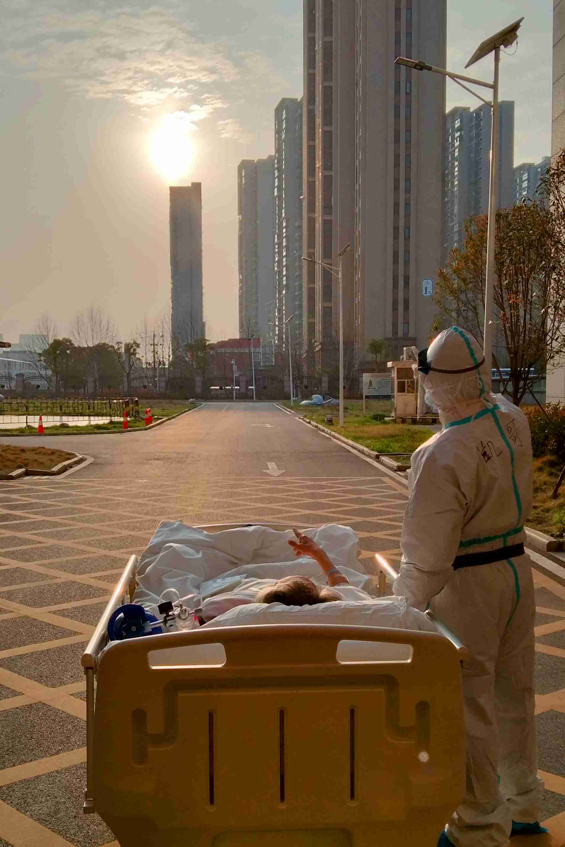 3月5日傍晚,武漢大學人民醫院東院,上海復旦大學附屬中山醫院援鄂醫療隊醫生劉凱,在護送患者做CT的途中,與住院近一個月的87歲患者一起欣賞日落。
