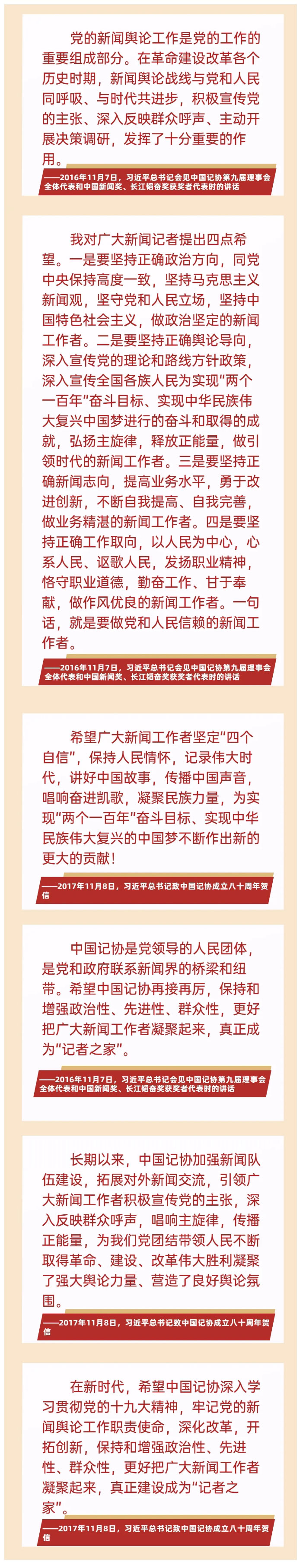 習近平總書記高度重視新聞輿論工作,十分關心廣大新聞工作者,充分肯定新聞輿論戰線為黨和人民事業作出的積極貢獻。他對廣大新聞工作者寄予厚望,強調“要做黨和人民信賴的新聞工作者”;對中國記協諄諄囑托“要真正建設成為‘記者之家’”。值此第22個記者節到來之際,讓我們一起重溫總書記重要論述,共同把總書記的親切關懷轉化為進一步做好新聞輿論工作的強大動力。