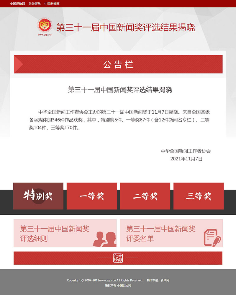 新華社北京11月7日電 中華全國新聞工作者協會主辦的第三十一屆中國新聞獎評選結果7日揭曉。來自全國各級各類媒體的346件作品獲獎,其中,特別獎5件、一等獎67件(含12件新聞名專欄)、二等獎104件、三等獎170件。
