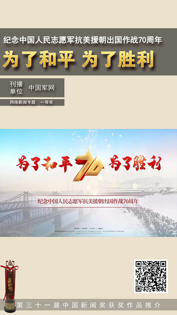 2020年是中國人民志愿軍抗美援朝出國作戰70周年,中國軍網推出大型融媒體專題《為了和平 為了勝利——紀念中國人民志愿軍抗美援朝出國作戰70周年》,用系列報道、網評、海報、H5等多種形式,從個體和微觀的雙重角度展示抗美援朝精神的薪火相傳,引起網民廣泛關注,取得較好傳播效果,作品獲得第31屆中國新聞獎網絡新聞專題一等獎。