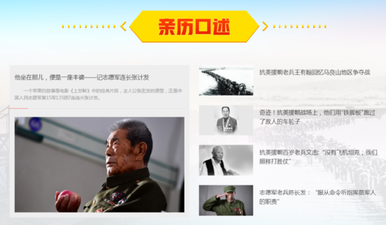 “老兵不老”抗美援朝老兵人物系列采訪是該專題的又一亮點,中國軍網記者前往上海松江區,在松江區退伍軍人事務局的協調下,先后采訪朱俊賢、沈秋生等6位抗美援朝老兵。通過其人生經歷和戰場故事,帶網友感受志愿軍戰士不畏艱難困苦,始終保持昂揚斗志的革命樂觀主義精神和不屈不撓的戰斗精神。