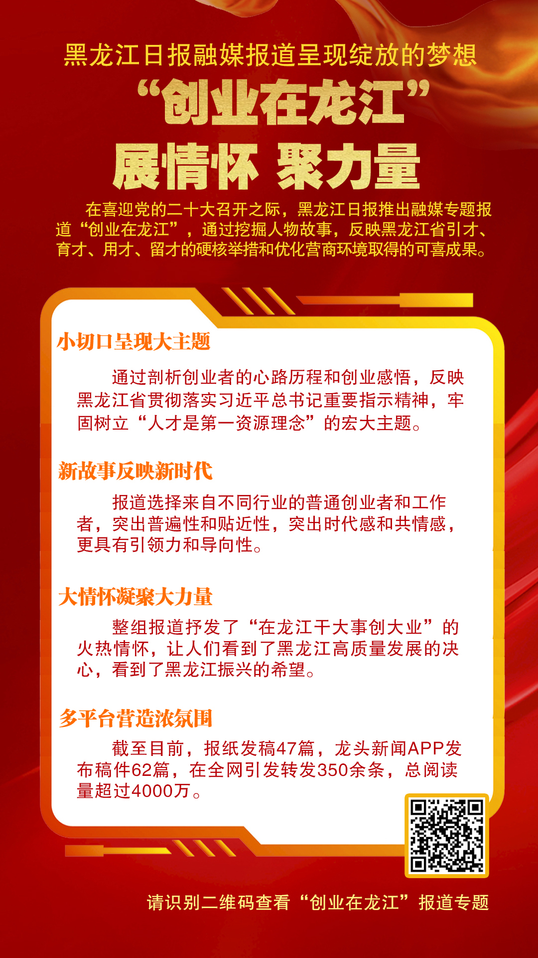 聚焦科技、教育等不同行業的創業者,通過深入剖析其心路歷程和創業感悟,講述一個個富有時代氣息的奮斗故事,立體反映黑龍江省加強人才建設、優化營商環境取得的成果,主題鮮明、表達生動、故事鮮活,引發受眾共鳴。
