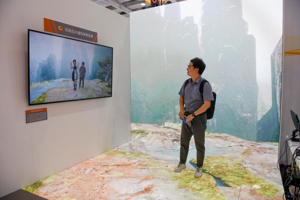 7月12日,參觀者在中國新媒體技術(shù)展上體驗沉浸式XR虛擬錄制系統(tǒng)。新華社記者 陳思汗 攝