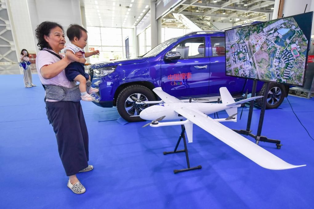 7月12日,在中國新媒體技術展的中國搜索展位,參觀者在參觀無人機設備。新華社記者 陳澤國 攝