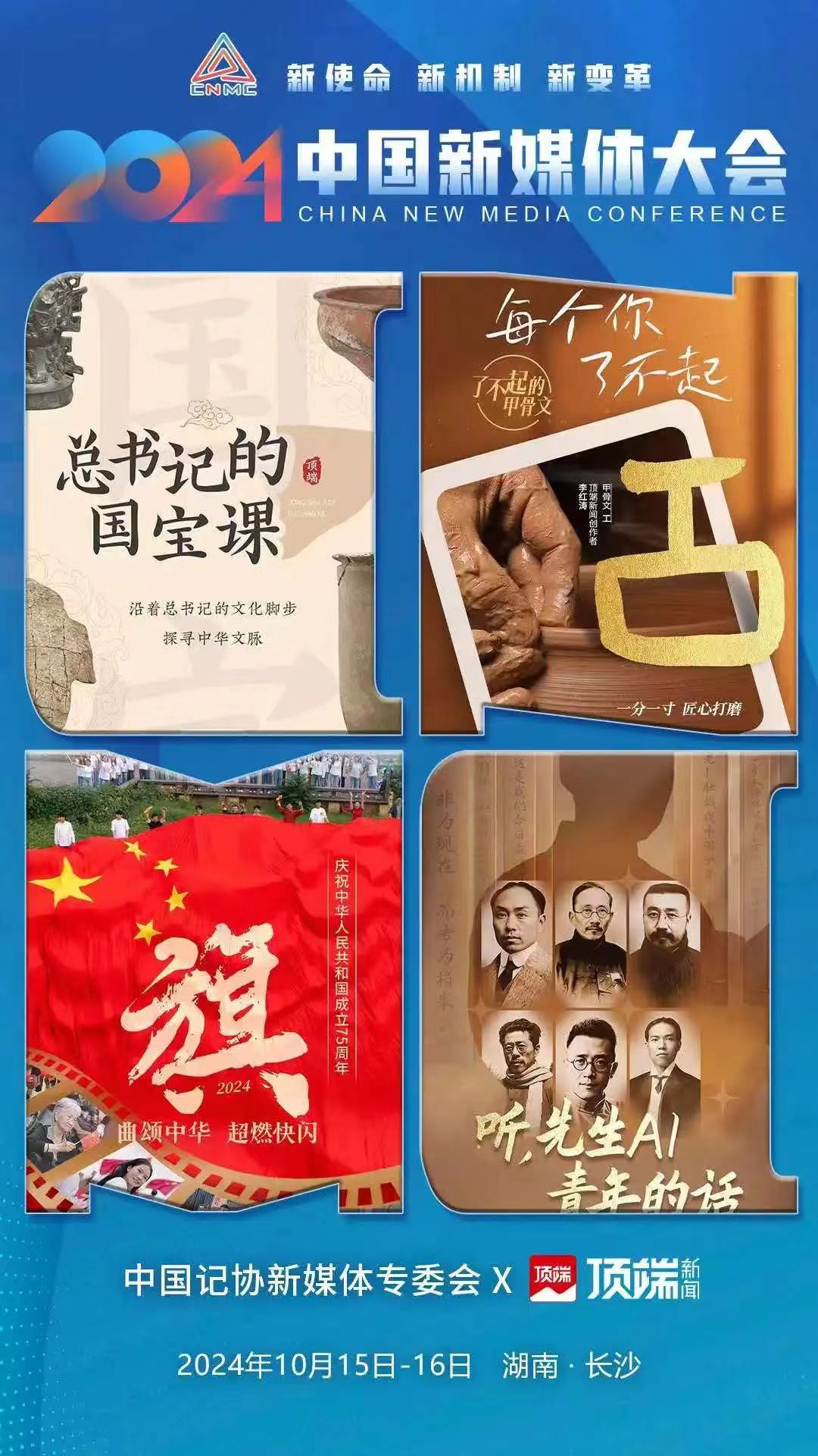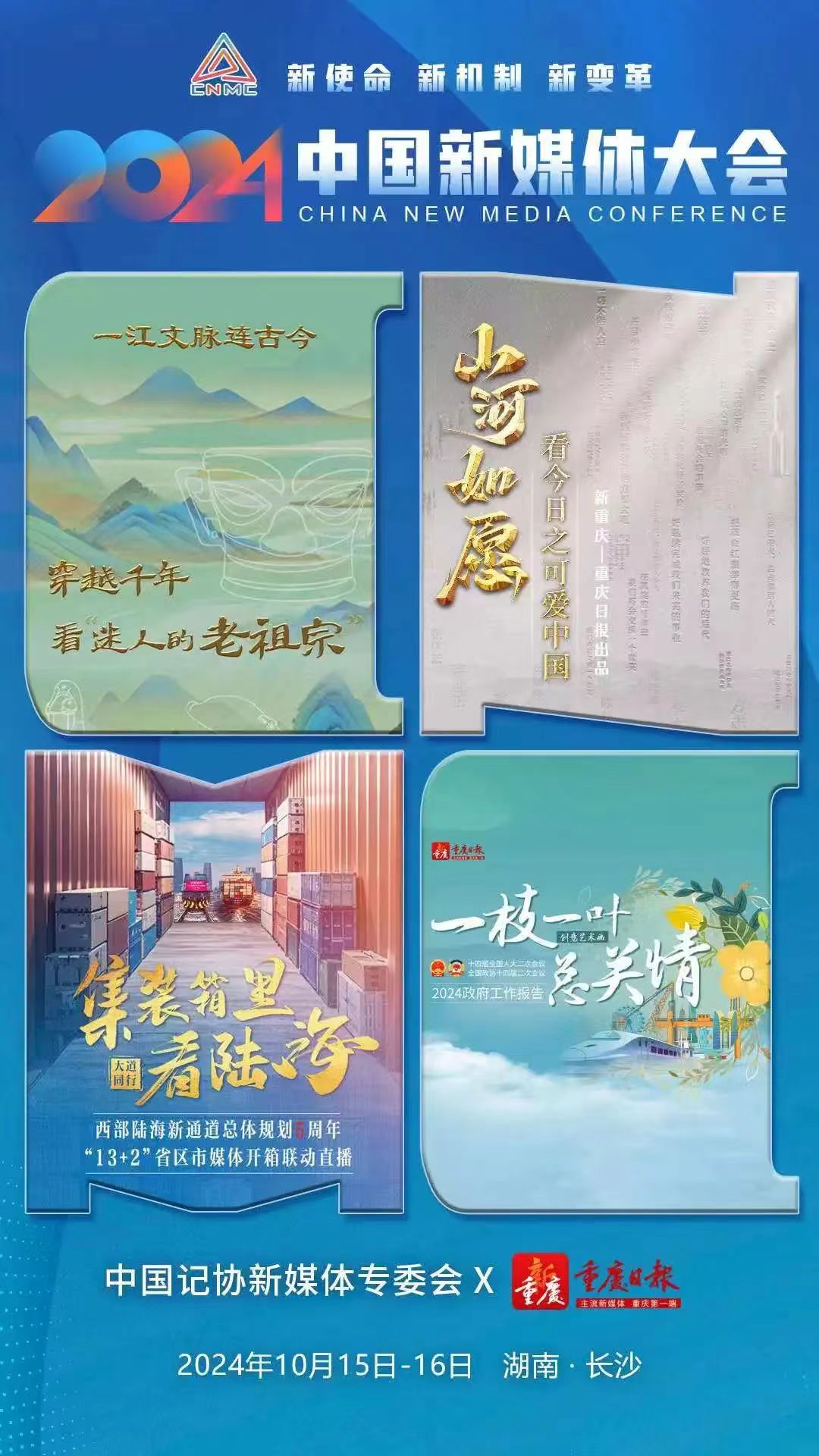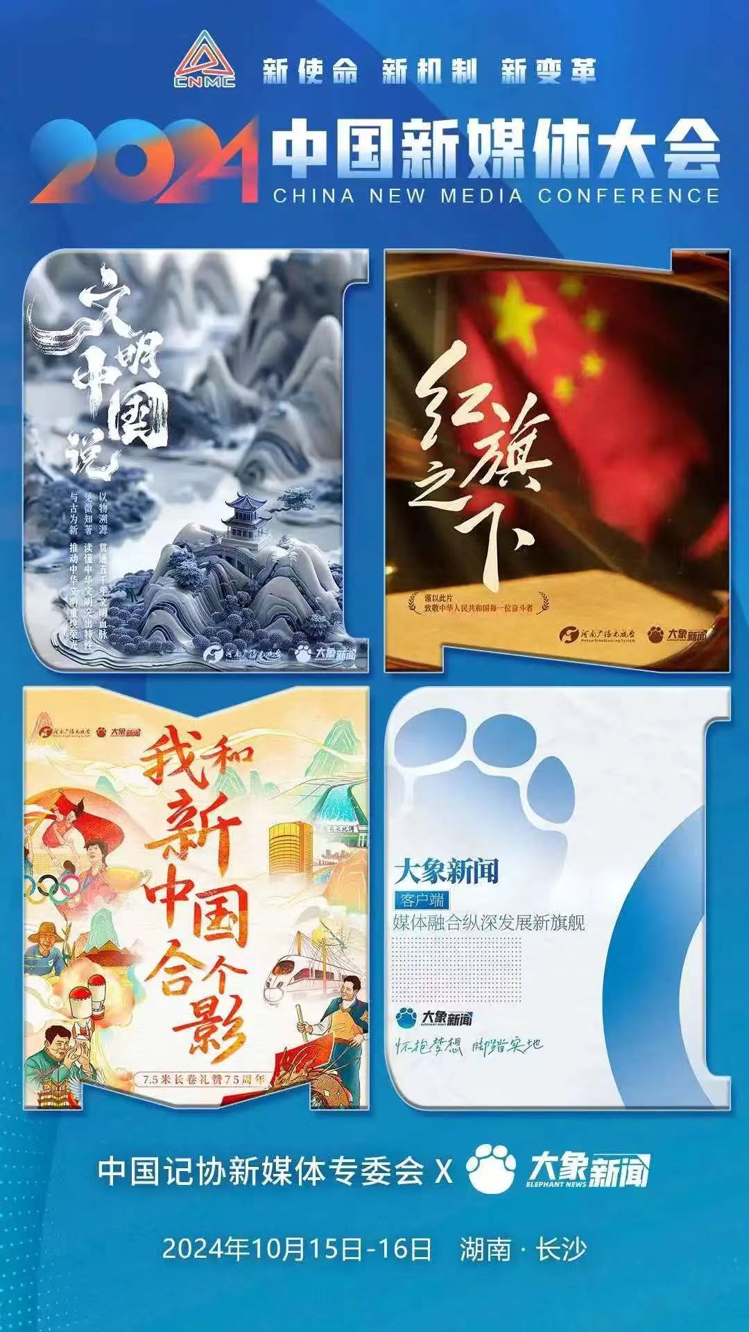2024中國新媒體大會將于10月15日至16日在湖南長沙召開,中國記協新媒體專業委員會各成員單位紛紛推出“聯名海報”為大會預熱。