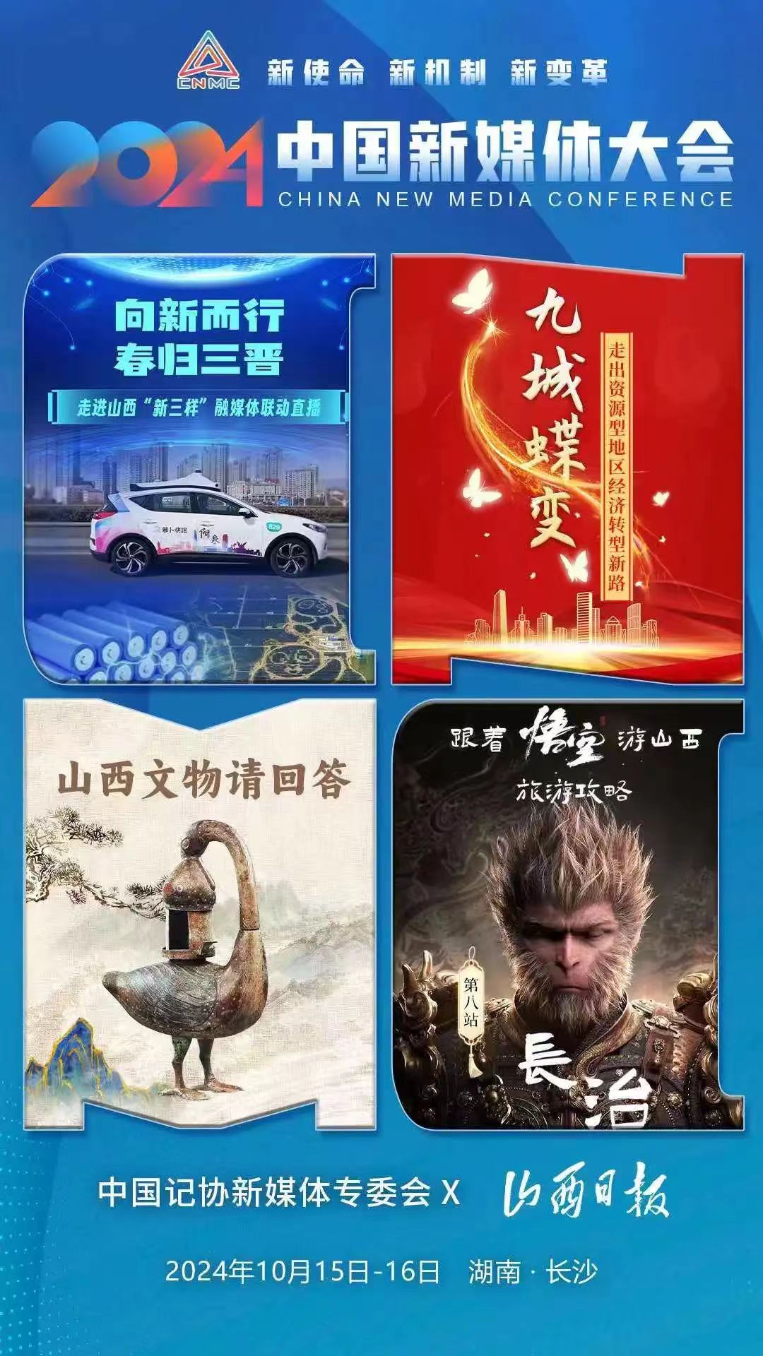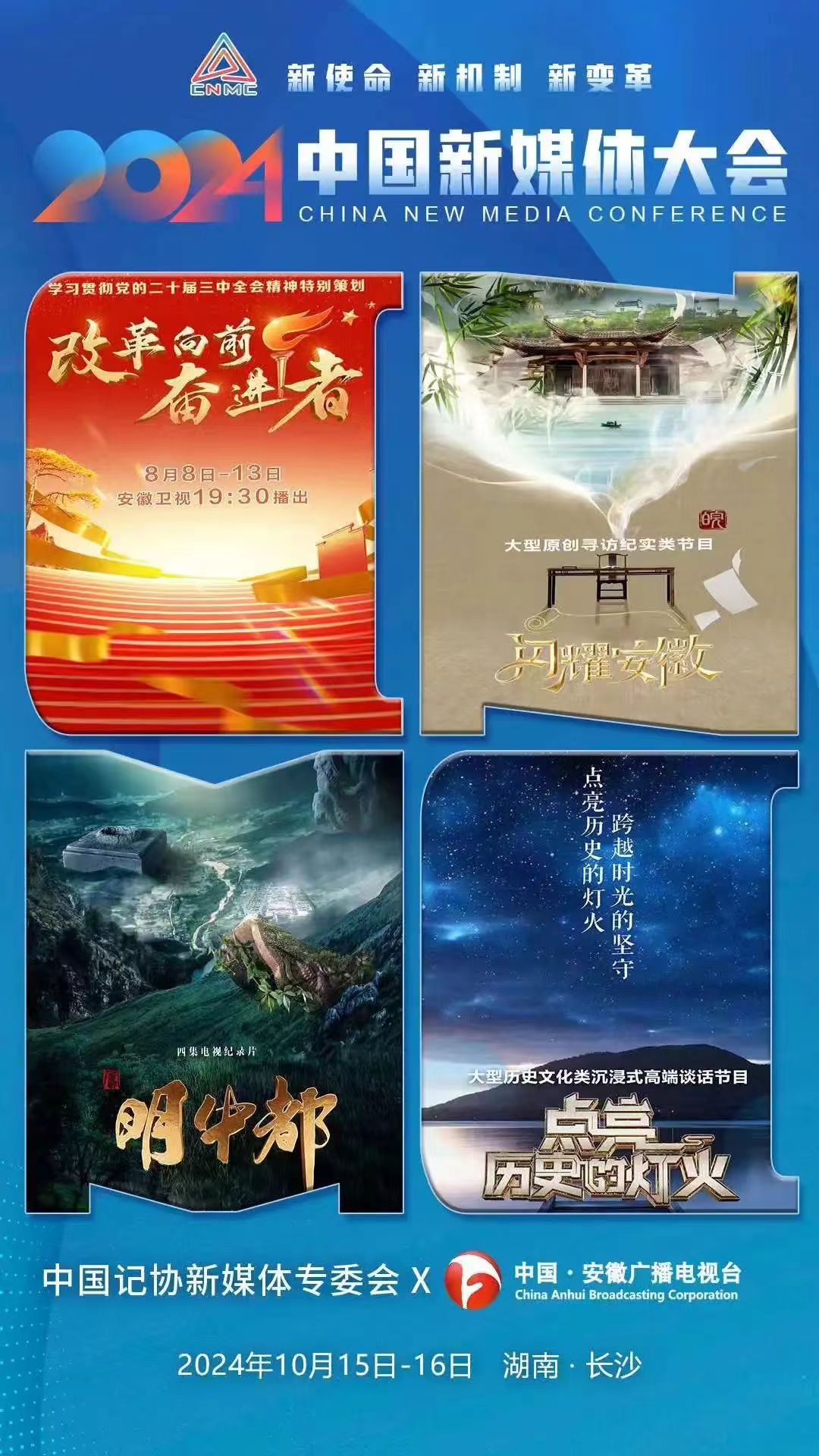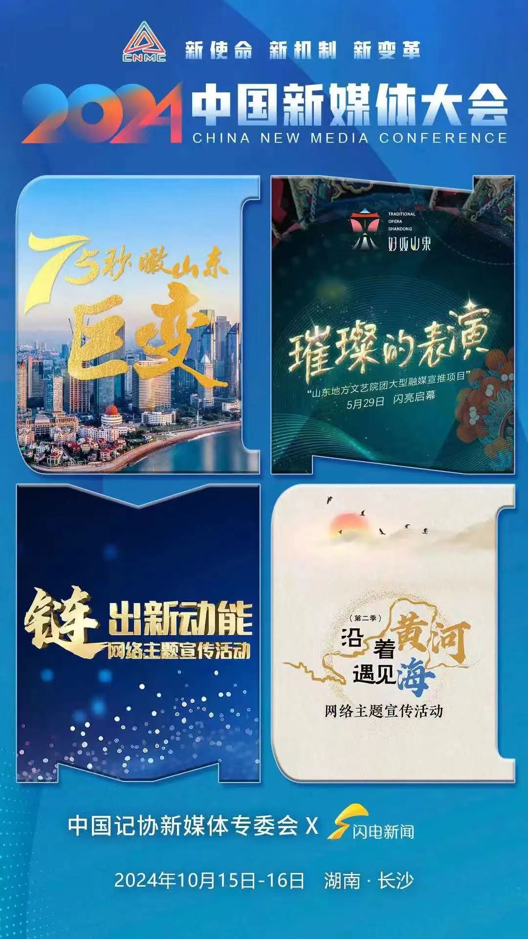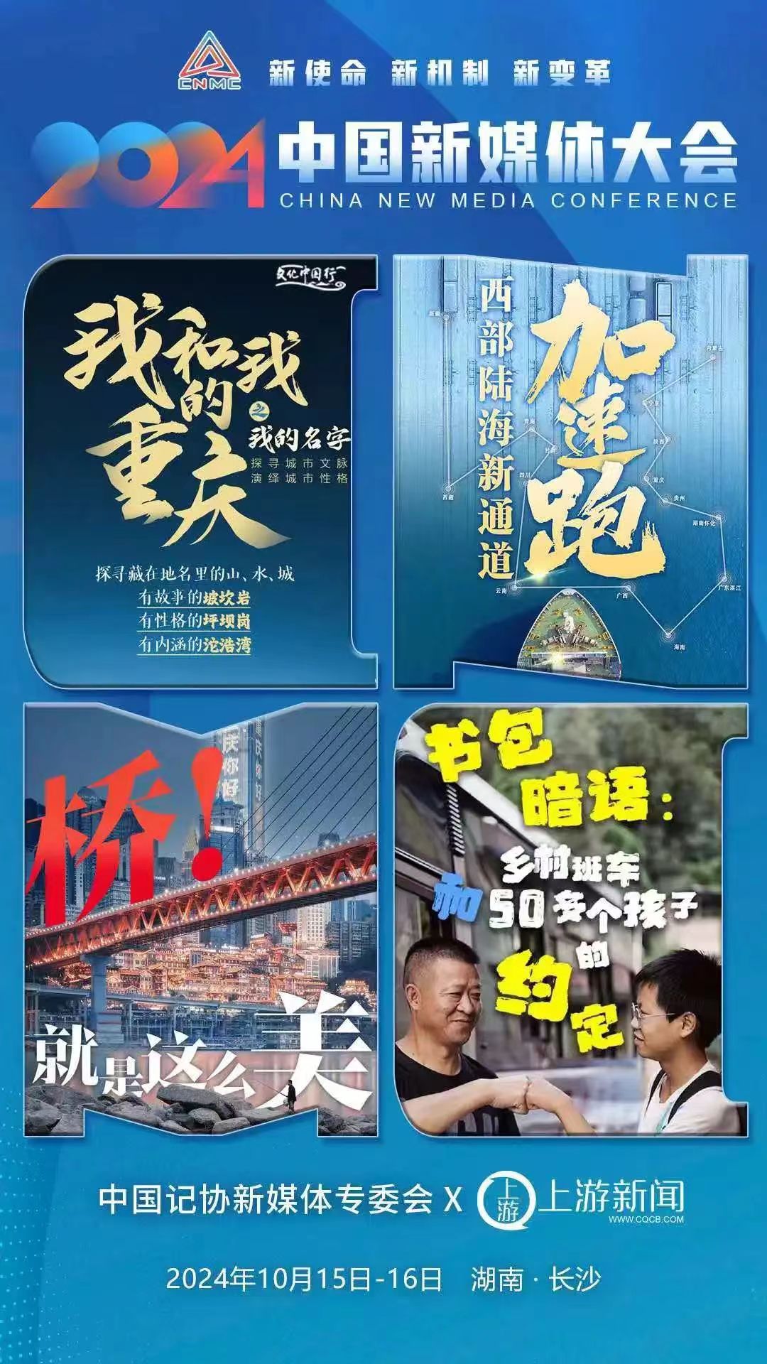 2024中國新媒體大會將于10月15日至16日在湖南長沙召開,中國記協新媒體專業委員會各成員單位紛紛推出“聯名海報”為大會預熱。