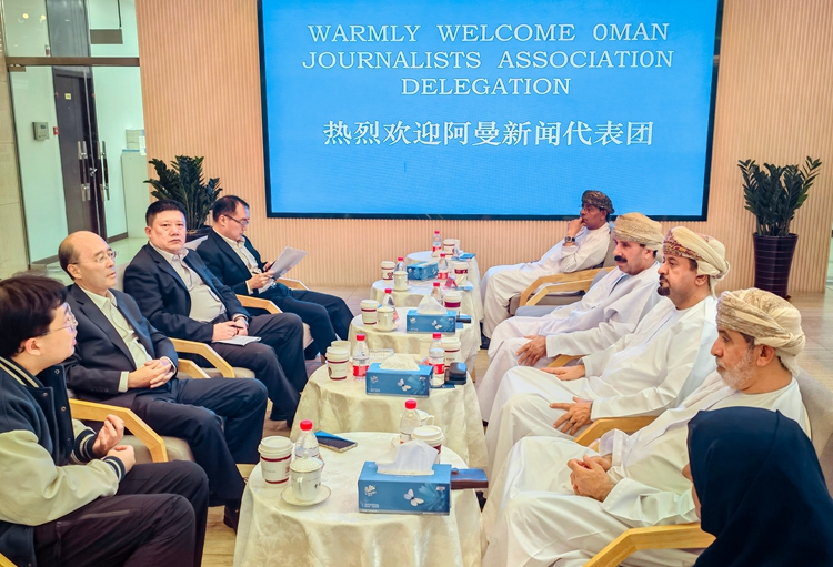 中國記協黨組書記、副主席劉思揚(左二)與阿曼新聞代表團會談。