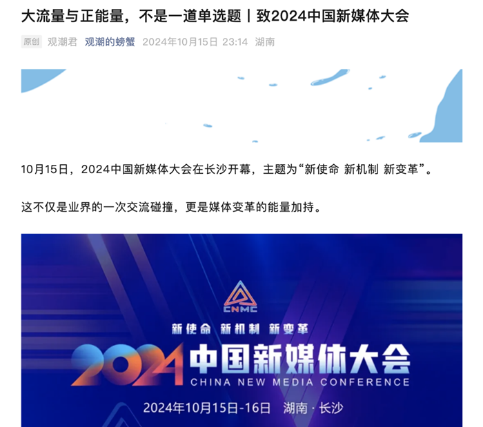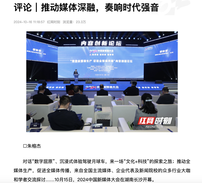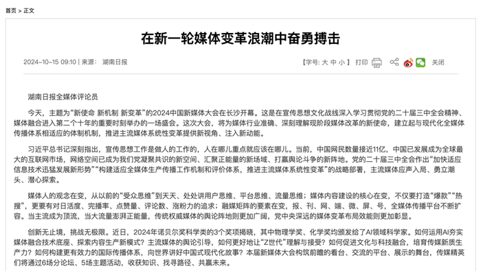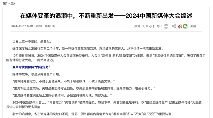 湖南日報《在媒體變革的浪潮中,不斷重新出發——2024中國新媒體大會綜述》