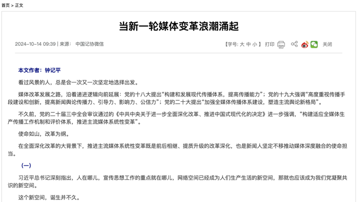 中國記協微信公眾號推出鐘記平文章