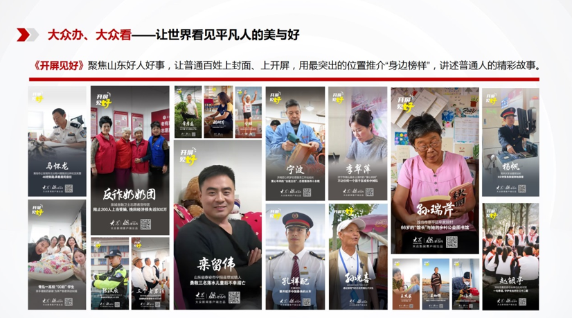 突出“媒体属性”,推动商业号建设从1.0到2.0进阶。我们将大报大平台商业平台账号由过去偏重“传播渠道”定位转变为“生产传播媒体”定位。突出“自主原创”,强化平台账号内容策划、生产、发布、互动、营销等全链条融合,通过提升内容影响力树主流、立导向。大众日报微信公众号全面提升内容原创力、舆论引导力、品牌运营力。去年8月份,我们打造的精品栏目《开屏见好》上线,聚焦山东好人好事,让普通老百姓上开屏、上首页,目前已展播约200期,全网传播量达2.65亿。在推动暖新闻网上传播的同时,积极与抖音、今日头条平台协同,在这些平台上建立专属话题页面,获得曝光资源支持,在互联网平台上实现“开屏见好”正能量充盈;携手社会爱心力量举办百期线下推介活动,为部分先进典型提供公益资金支持,以平台之力探索媒体与社会力量联合共建的新路径。