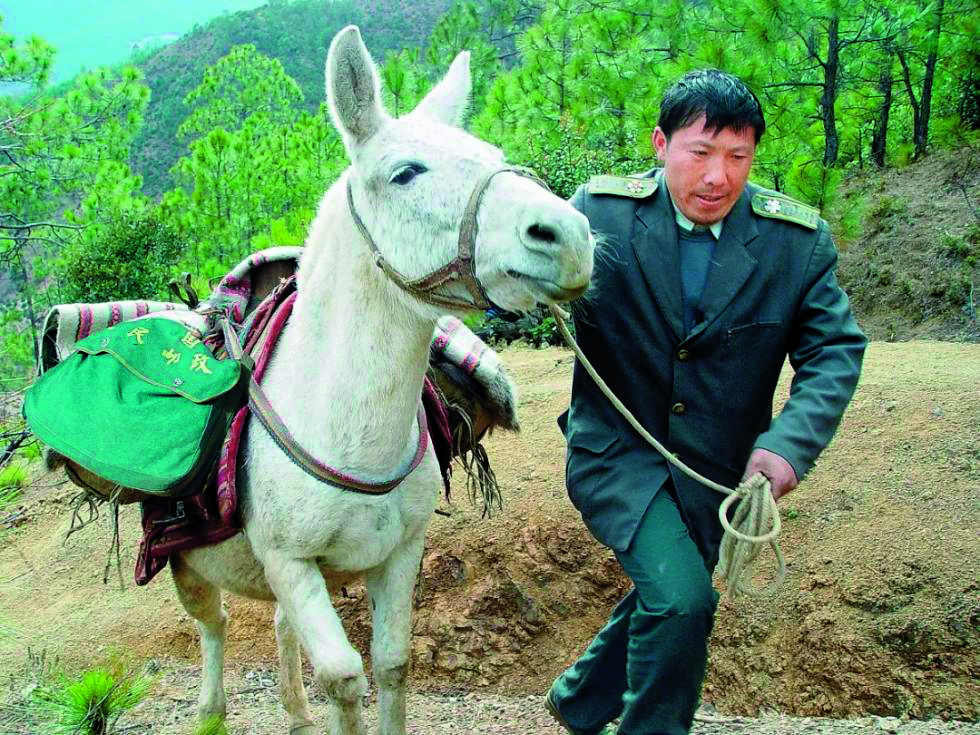 《索玛花儿为什么这样红——记优秀共产党员、木里县马班邮路乡邮员王顺友》的主人公王顺友在邮路跋涉。