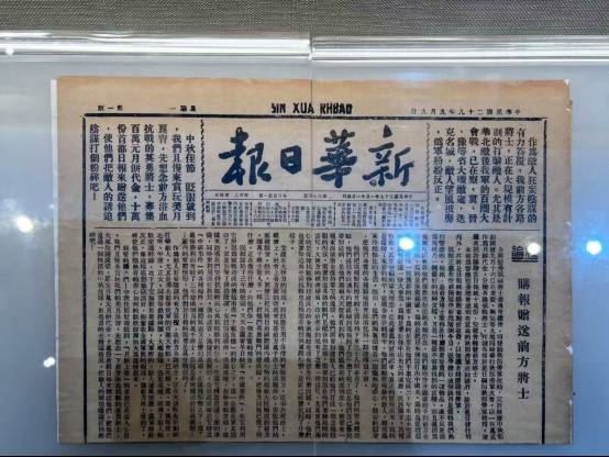 百团大战纪念馆负责人秦茹说,《新华日报》一直以来坚持发动民众声援前线,百团大战纪念馆馆藏实物也印证了这段历史。1940年9月9日《新华日报》刊发社论《购报赠送前方将士》,呼吁读者中秋集资赠报,并特别指出“报纸,是前方将士看得比什么都要珍贵的一种物品。”报社自身也做出表率,购报劳军者“对折收费”,与民众的捐款、声援共同构成了全民抗战的生动局面。(文中图片来源于百团大战纪念馆)