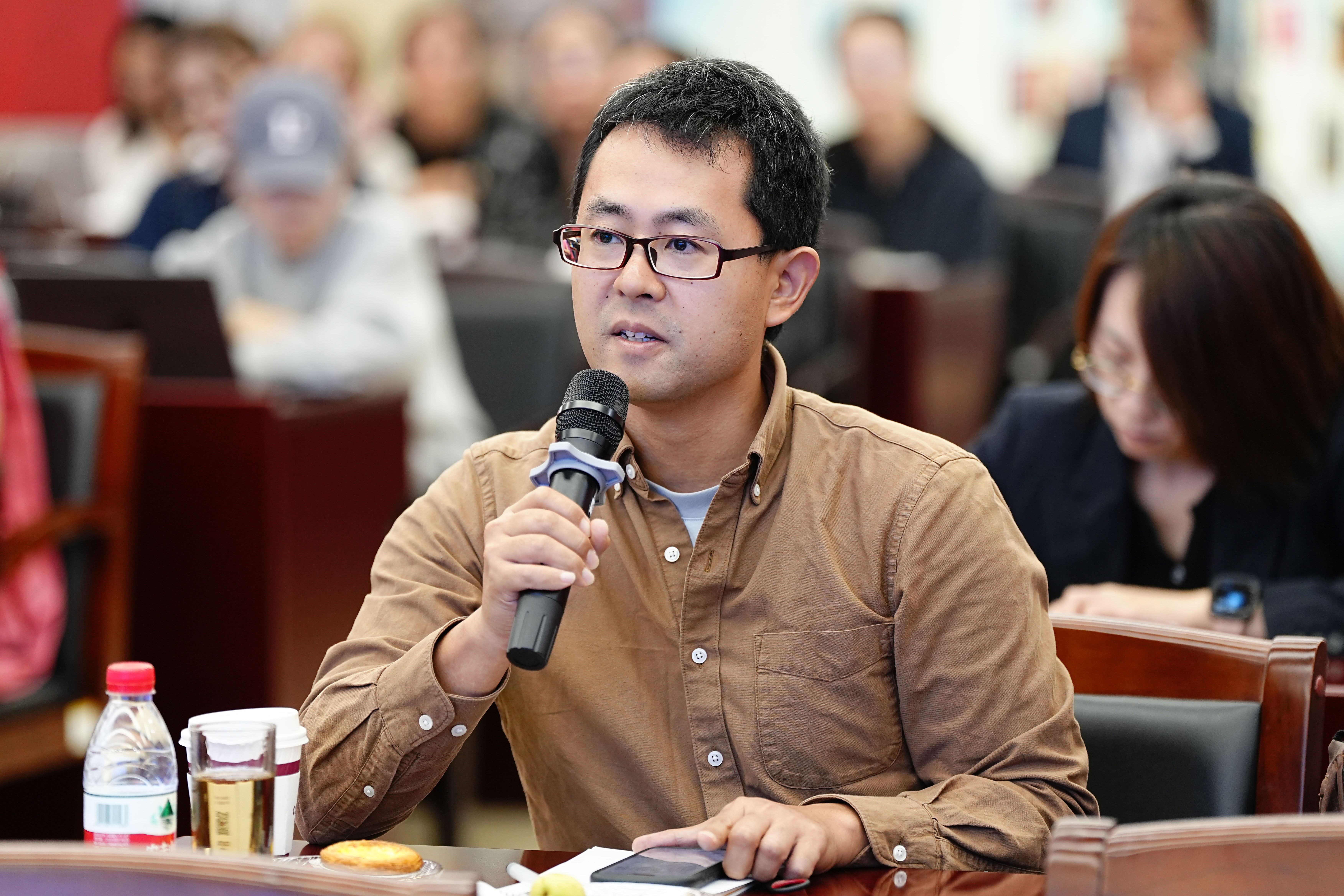 记者与新闻茶座主讲嘉宾交流。