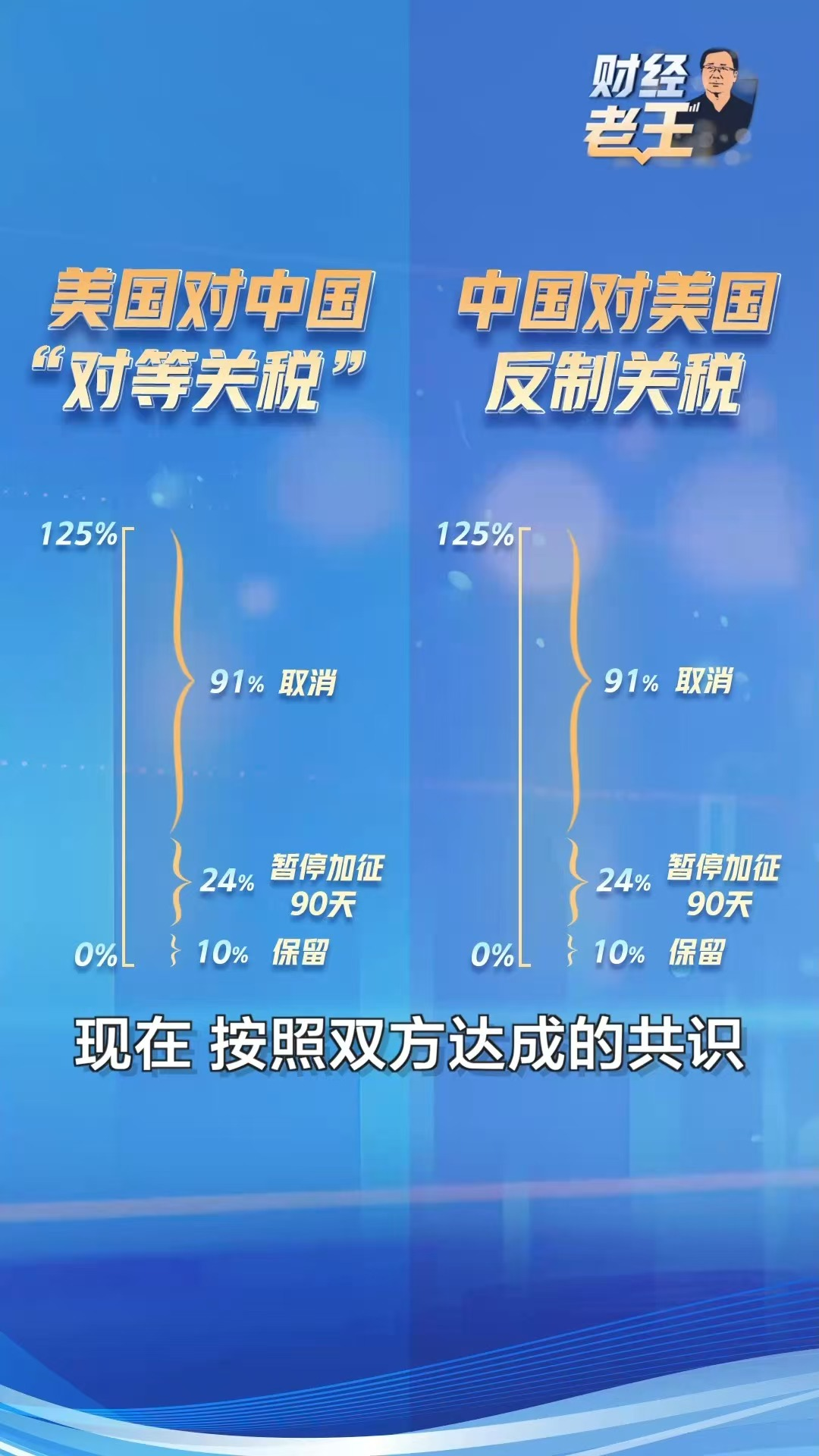 内容方面,《财经老王》持续深耕财经专业领域的政策解读与新闻述评,这么多年的报道经历,让我也可以算半个专家了。我们持续关注中美贸易战、央行、金融监管总局、证监会的政策等热点话题,并多次以独家权威、快速解读和贴近受众的内容成为热搜话题推荐视频,有效引导了舆论方向。中美日内瓦经贸会谈结束后我们出了一期报道。当时谈判结果一出,全网都在问关税到底降到了多少?看不懂声明到底说了啥。我们四两拨千斤,用一张图让大家一目了然,也收获了网友的认可。