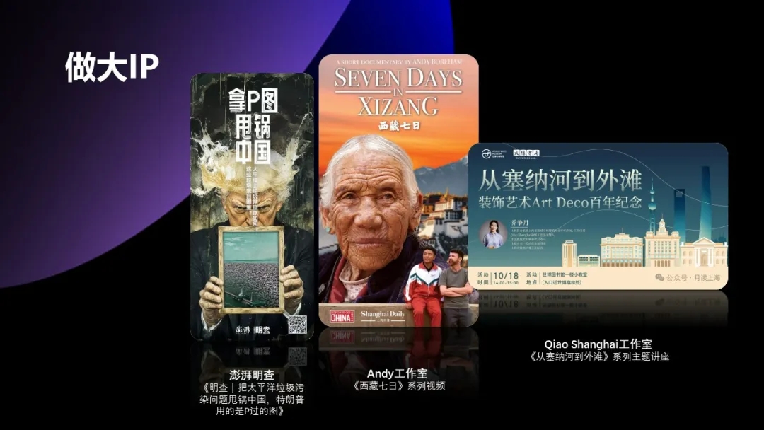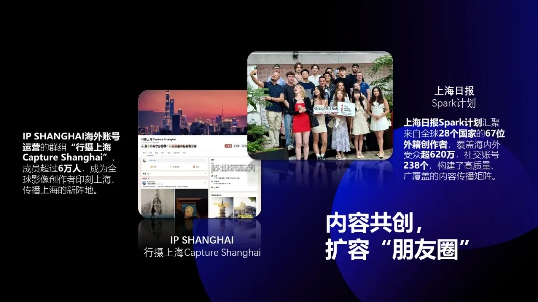 上海日报的Spark计划经过一年半的运营,培育出活跃的创作者生态,汇聚来自全球28个国家的67位外籍创作者,覆盖海内外受众超620万(海外比例接近一半),社交账号238个,构建了高质量、广覆盖的内容传播矩阵。IP SHANGHAI海外账号运营的群组“行摄上海Capture Shanghai”,致力于记录上海美丽瞬间,通过镜头展现其独特的文化和魅力,成员超过6万人,成为全球影像创作者印刻上海、传播上海的新阵地。